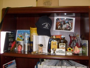Oh my corner bookshelf of memorbilia. Basically this a great collection of stuff and things. From rum to a hoping nose to a picture of me riding a bull backwards…its all there.