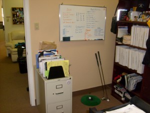 Here’s my window/door view and yes that is a driving/putting range in my office…it clears the mind. And here is one last parting view, obviously I am very proud of the work Karina and I have accomplished 2 years ago. There she is in a picture taken at our Holiday party, good times! That next to us is Gizmo sitting on one of 5 surround sound speakers that can push out 100 watts per channel and can make my customer service reps’ ears bleed if so desired. Obviously my high-fidelity accoustics are not standard issue office equipment.